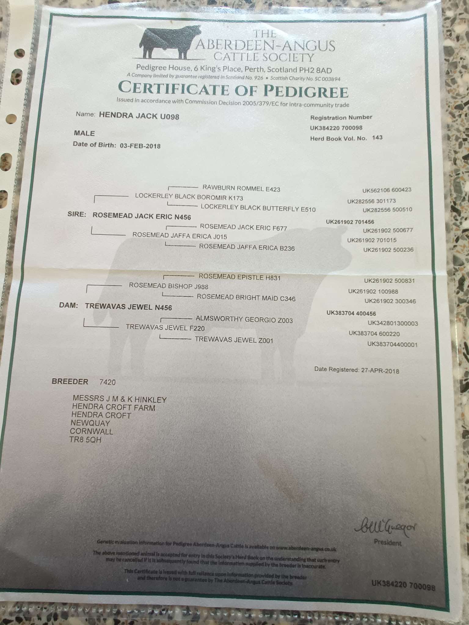 Pedigree Aberdeen Angus BullGood sort, worked well and only on offer as daughters coming back into the herd. Easy calver and great temperament. Ready to go