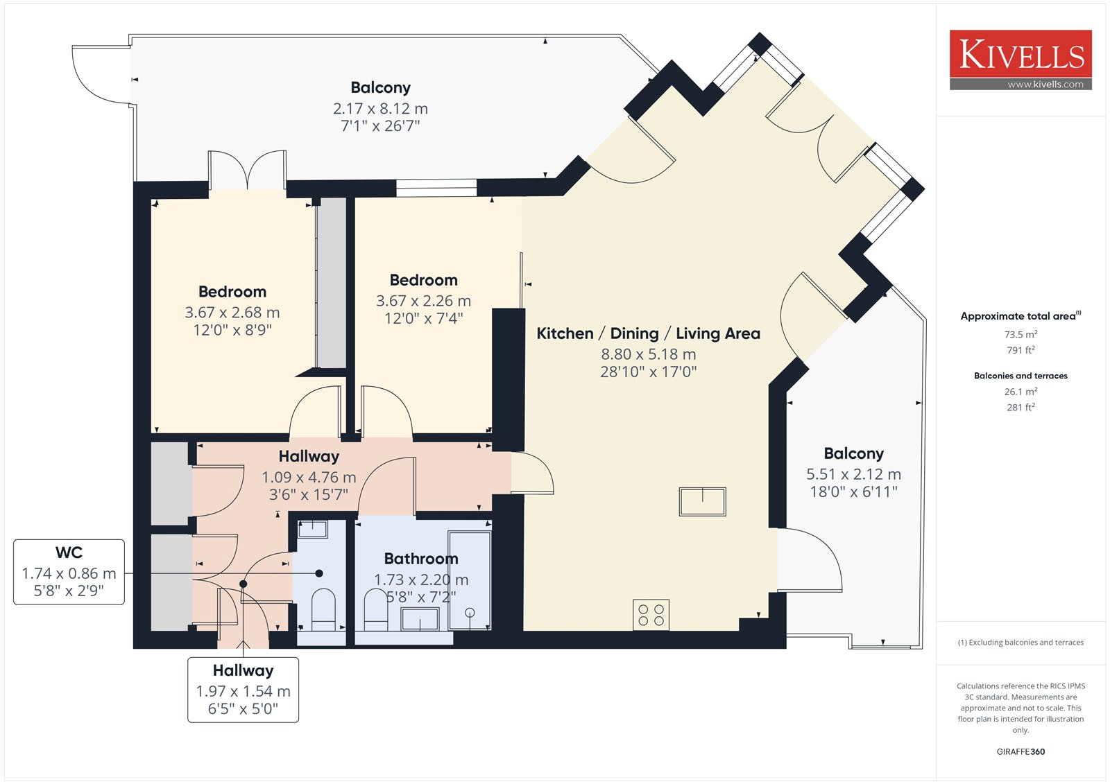 The living and dining areas offer excellent flexibility for furniture placement, complemented by recessed spotlights, fitted carpet, and a pocket door to Bedroom Two. Double doors lead to the Juliet balcony, while a separate door opens to the west-facing balcony.