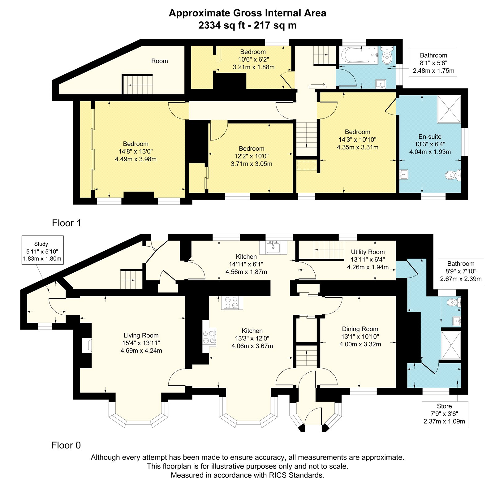 The ground floor offers three generous principal reception rooms—a kitchen, dining room, and living room—each of similar size and character. These are complemented by a utility room, a secondary kitchen area, a shower room, a study and several useful store rooms. Two staircases lead to the first floor, where there are three well-proportioned double bedrooms, including a master suite with en-suite facilities, a single bedroom, and a further family bathroom.