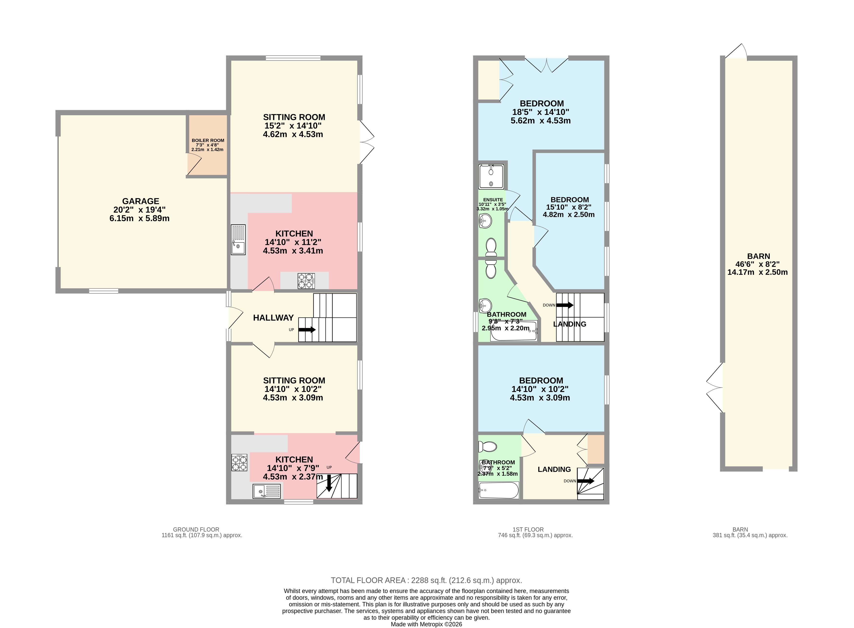 The Yoke includes an open plan kitchen and sitting room on the ground floor with access to the garden and a double bedroom and bathroom on the first floor. Attached to The Furrow is a large garage accessed from the parking area.