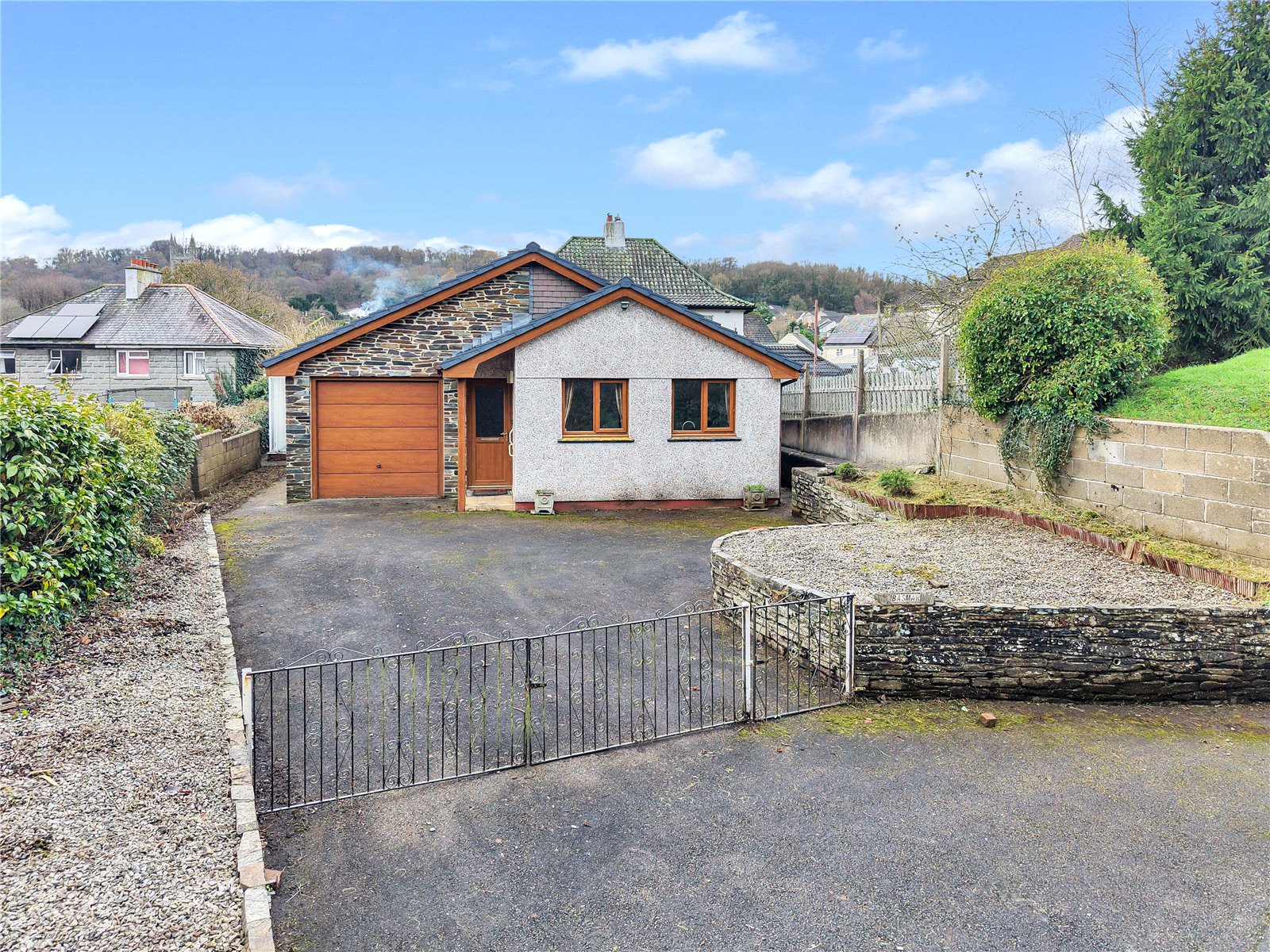 Outside Metal double gates with pedestrian gate lead to the front of the property which is mainly tarmacked providing parking for a number of cars. Stone walled raised beds. Pedestrian access to both sides of the property leading to rear garden.