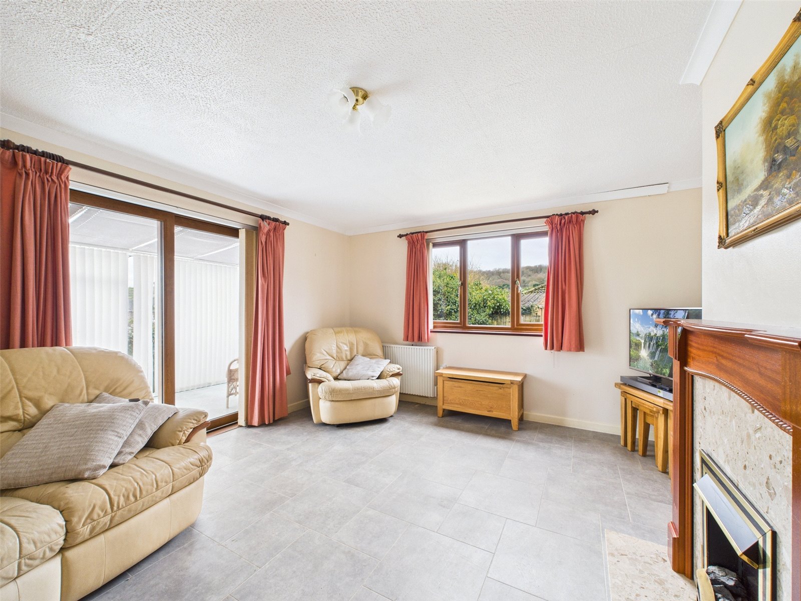 LIVING ROOM Window to the rear elevation. Vinyl flooring, radiator, inset electric fire with marble hearth and wooden mantel. Space for living room furniture and sliding doors to:-